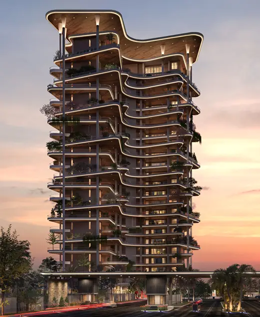 100m+ high ultra-luxury residential building spread across a 5-acre site with a built-up area of 3.92 lakh sqft. 44 units distributed across 23 levels, surrounded by vast landscaped spaces for each residential unit.